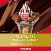 「キットカット」まるごと2本に、チョコホイップ、チョコソース、生チョコアイスをトッピングした、チョコ尽くしの贅沢コラボパフェが完成!